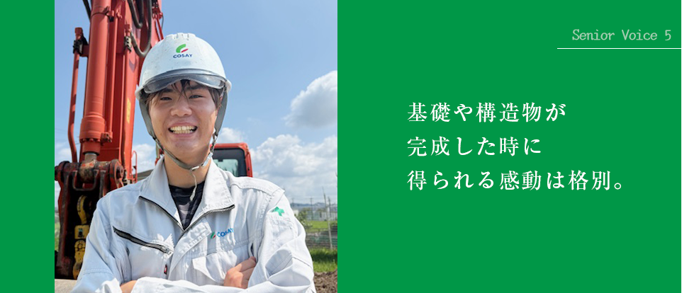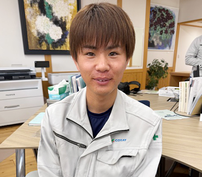 - 高校時代に土木の勉強をしていたので、卒業後も土木関係の仕事をしたいと思っていました。会社説明会に参加した際、現場に連れて行ってくださり、建設の仕事を通して「地元に貢献できる仕事はこれだ!」と思い、入社を決めました。